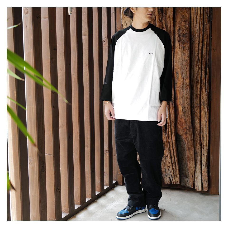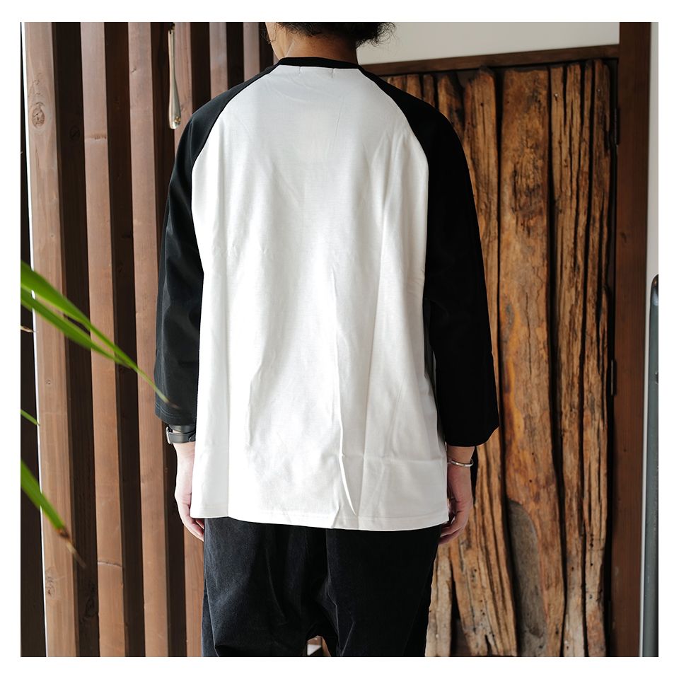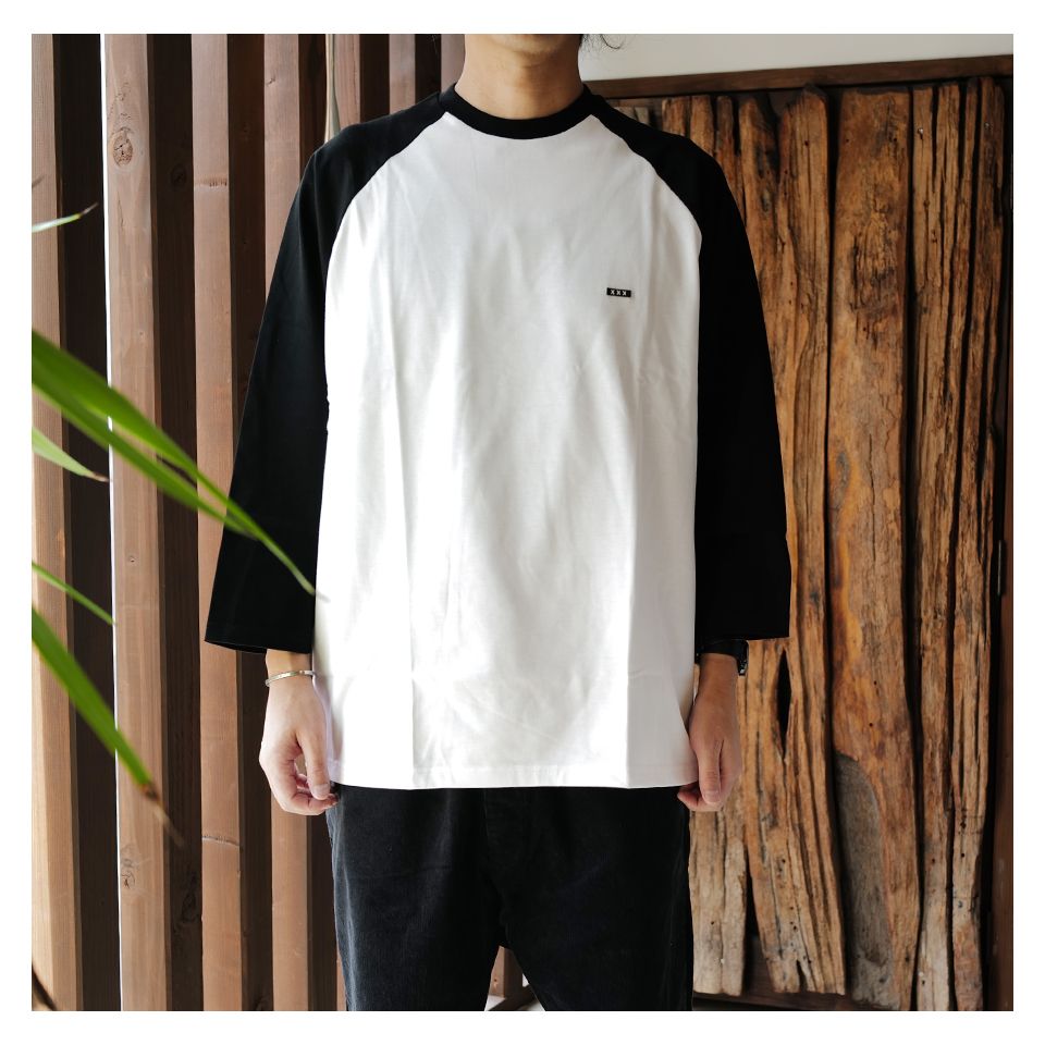 ラグランスリーブTシャツ、七分袖のBLACKxWHITEの配色、胸元にはXXXワンポイントワッペン。(183cm70kg, Size-XL)