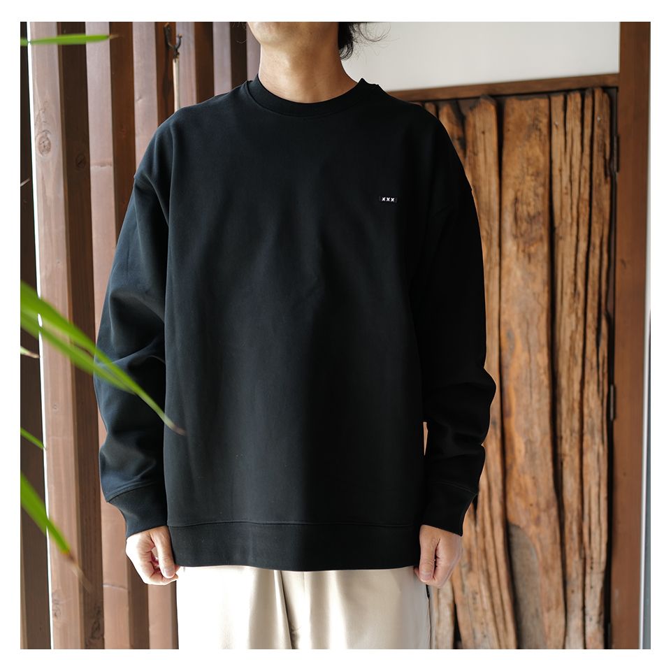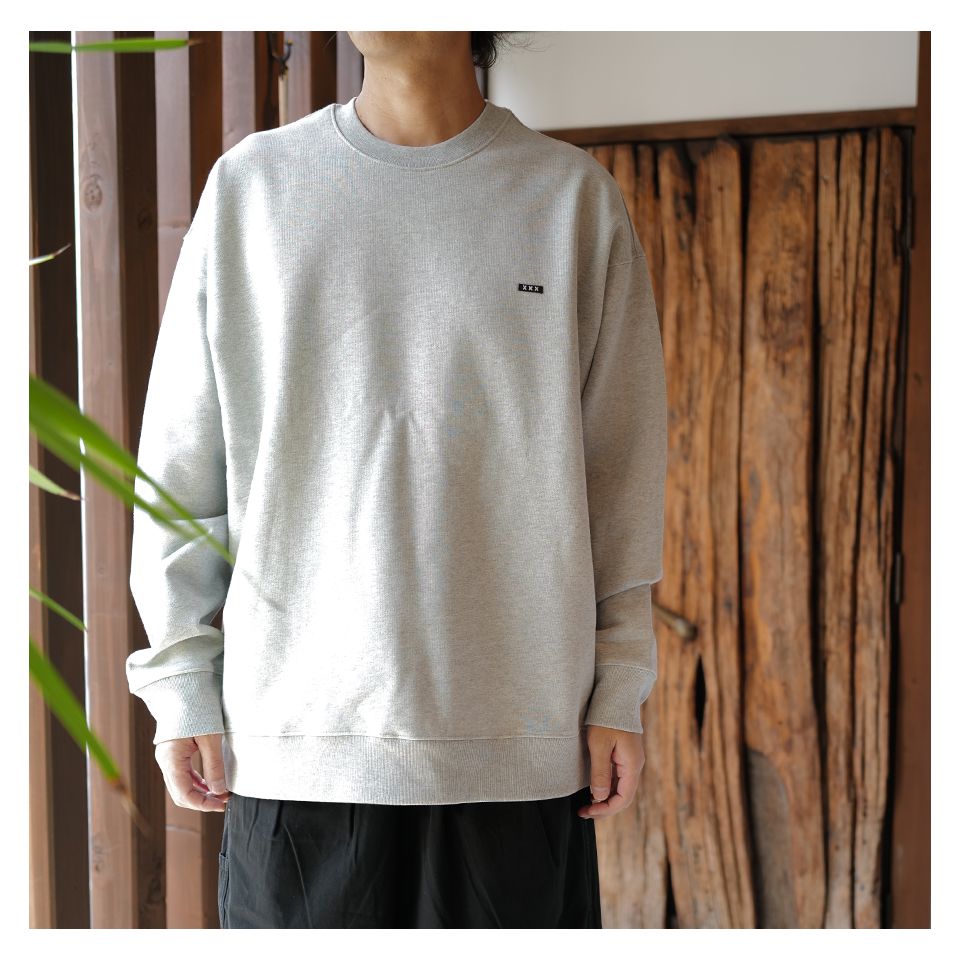 裏起毛、XXXワッペンが胸元にデザインされたスウェット。