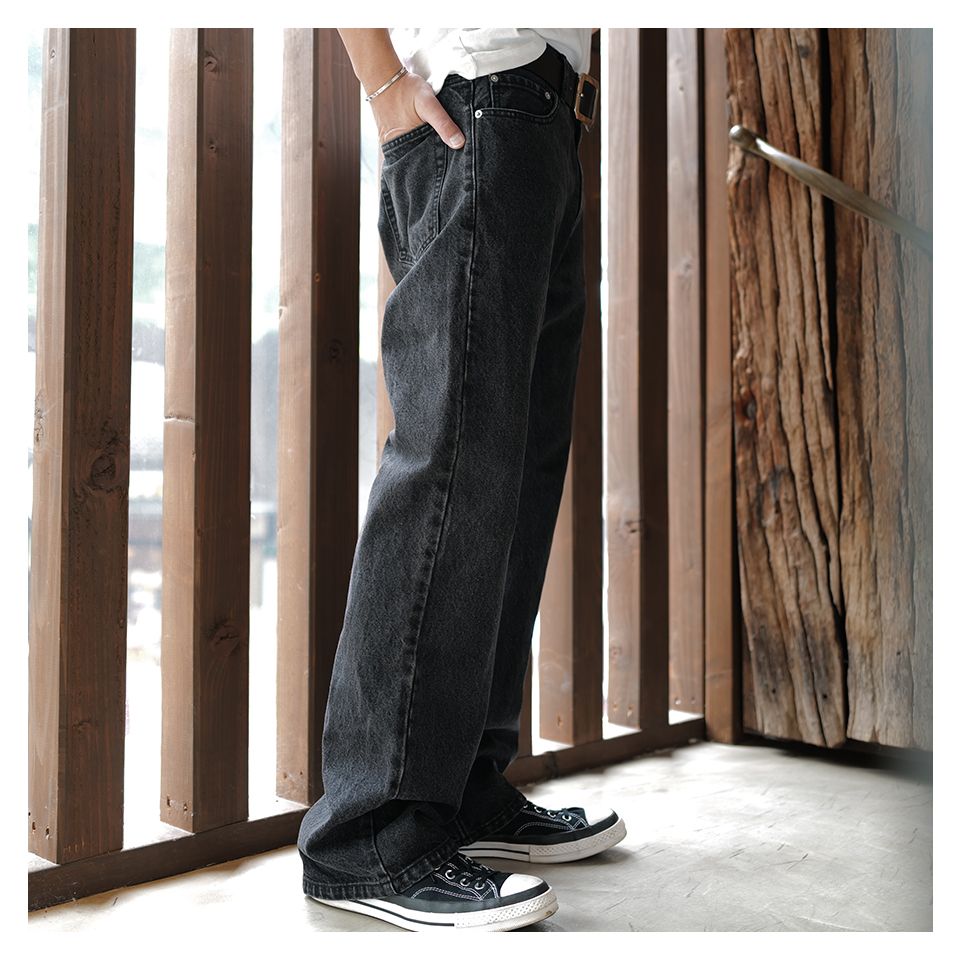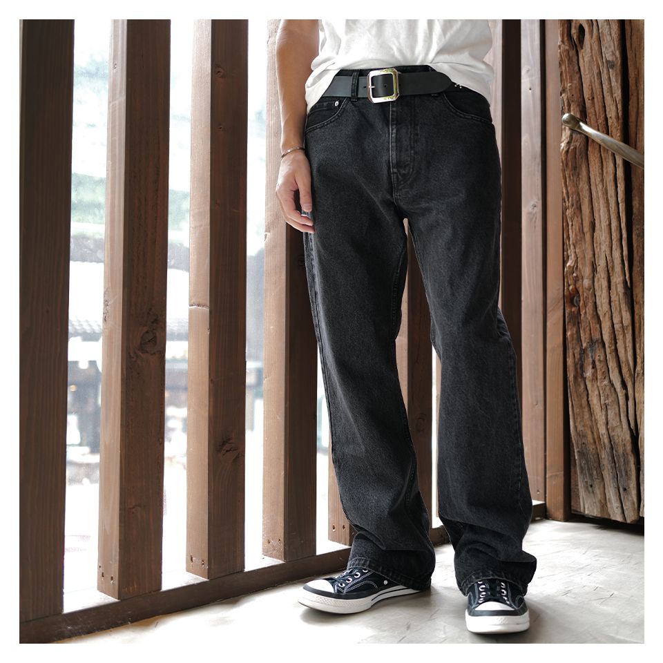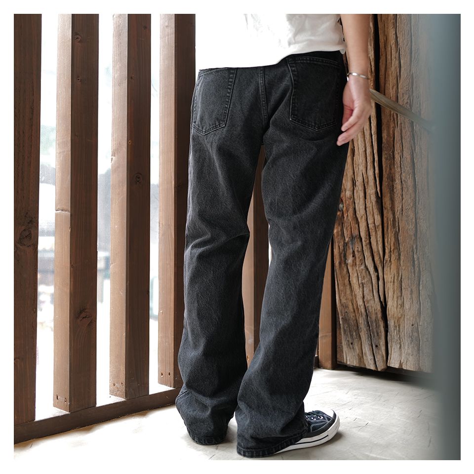 初めにご紹介したスラックスと同様で股上深めで、見た目がきれいなデザイン、スニーカーは勿論、ブーツや短靴にも相性の良いシルエットになります。