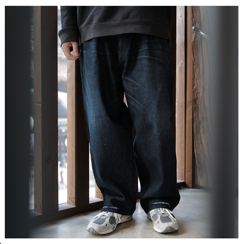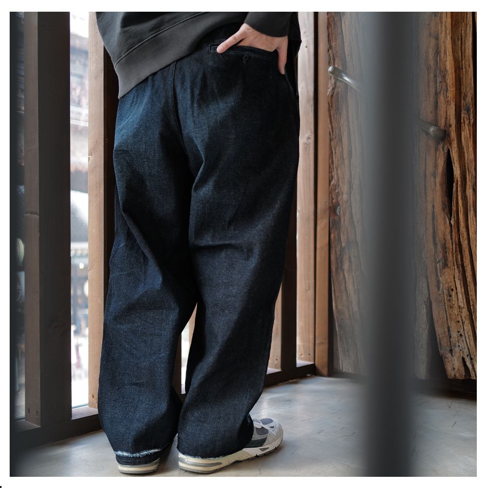 デニム素材でワイドに仕上げた2TACのワークパンツ、股上が深く太ももから裾にかけてテーパードしたシルエット、スラックスのパターンを取り込んだデザインでシックな組み合わせから、ワーク、ストリートカジュアルにいたるまで様々なウエアーにマッチしてくれます。