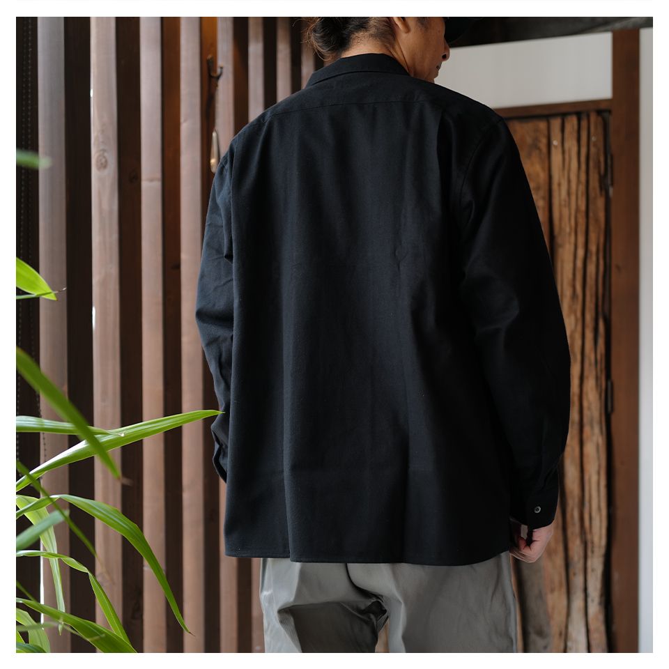 まずはオープンカラーシャツ、ネル素材でモールスキンの様な触り心地、シャツとしても、また薄手のシャツジャケットのように着用してもおすすめです。