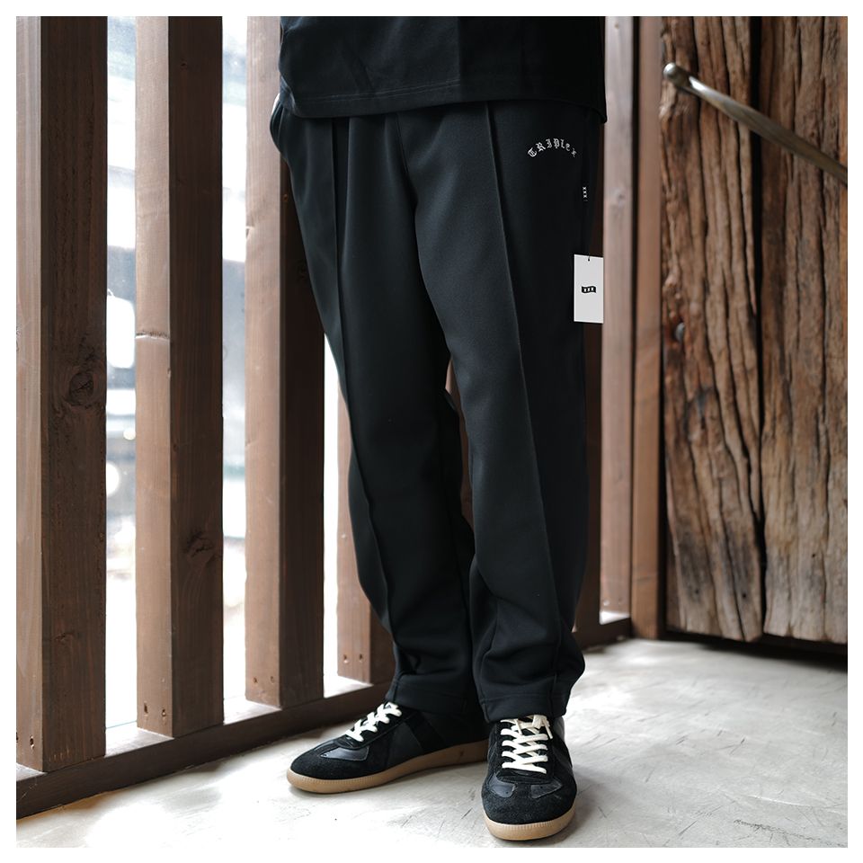 ワンポイントで刺繍の入ったジャージ素材のトラックパンツ