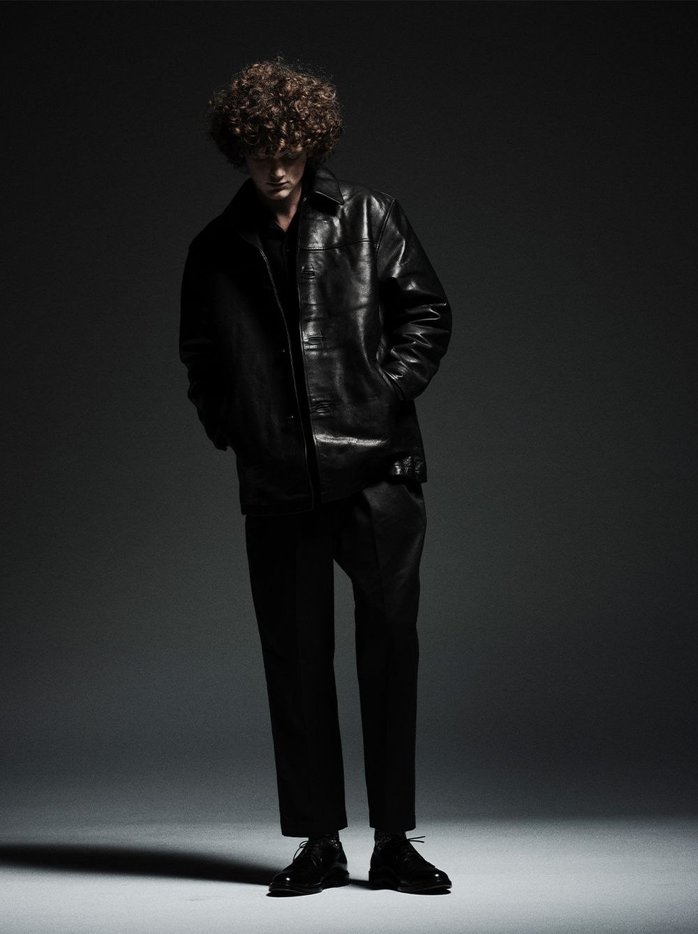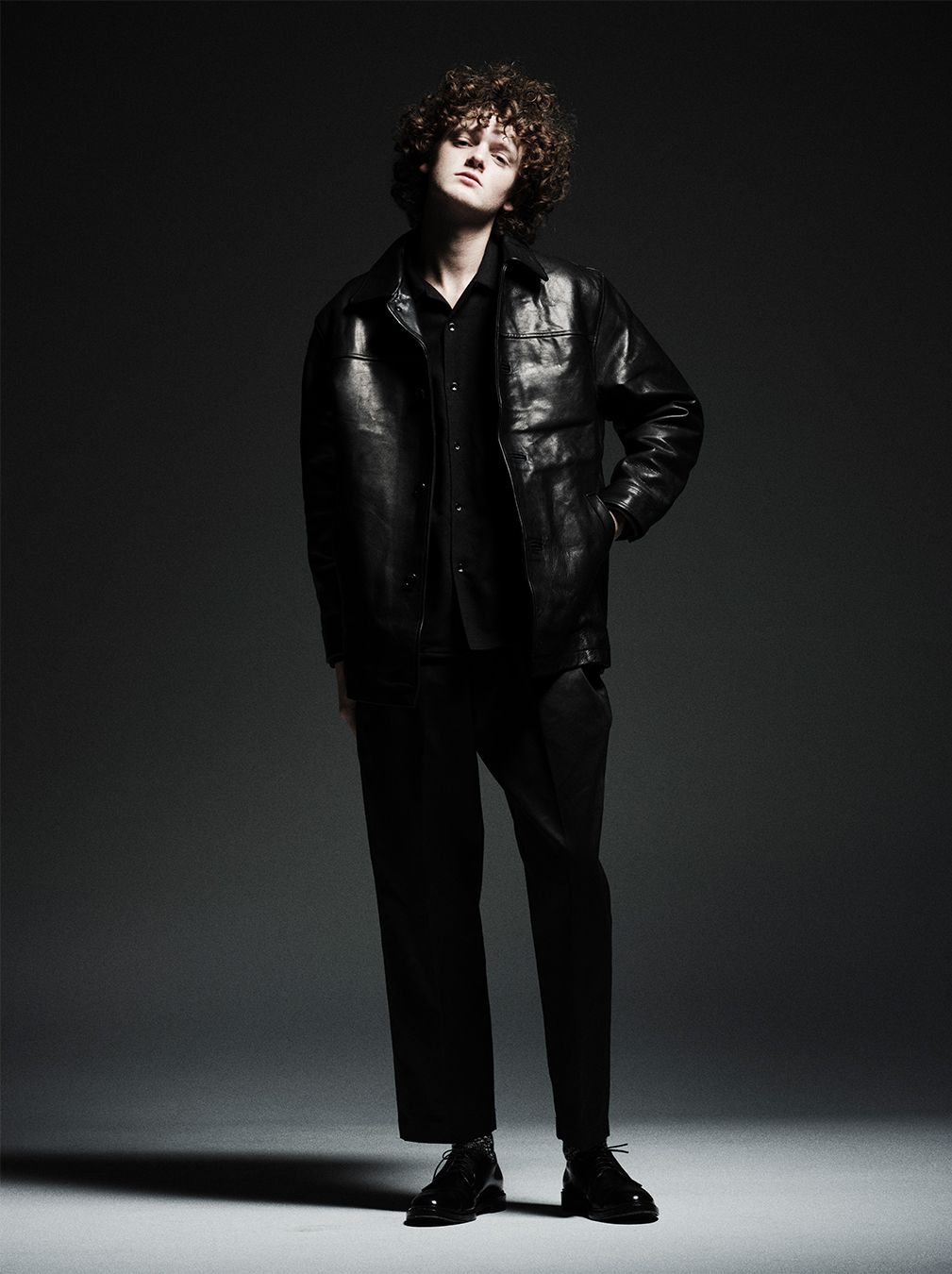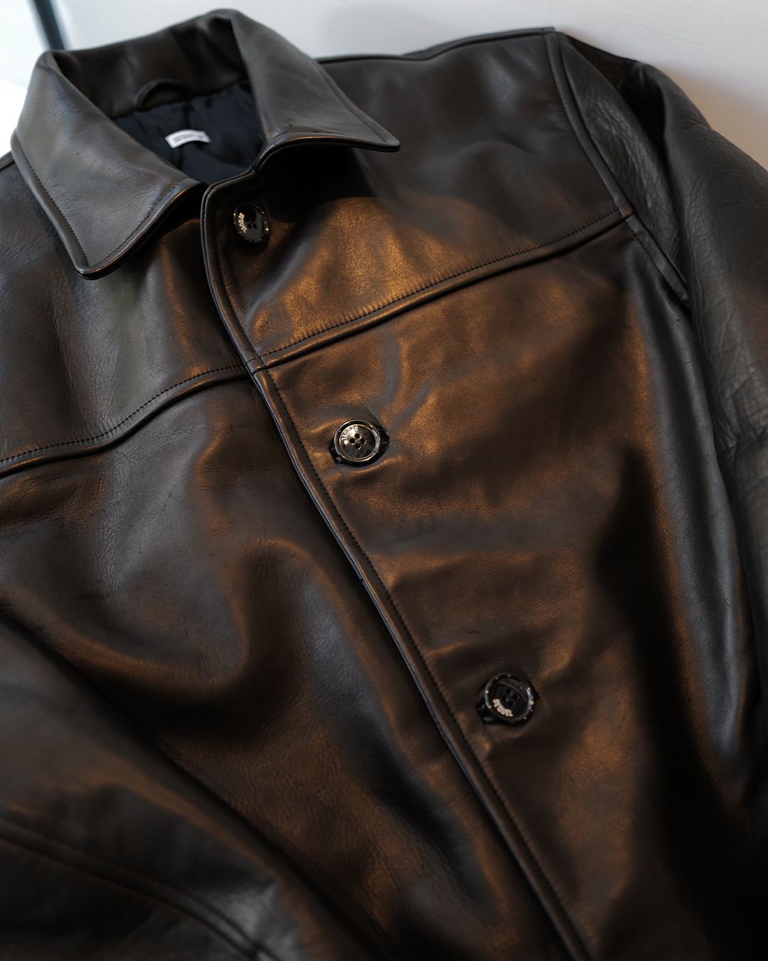 ディテールも抜かりなく、左胸の内ポケットは実用性を高めながら表から見たときのラインを崩さない配置。フロントにはSEQUELのロゴ入りオリジナルボタンを採用し、ブランドらしいミニマルな主張をプラス。丈はやや長めのミドルレングスで、レザーの重心を下に落とし、体のラインをスッと縦に見せてくれるバランスに仕上がっています。