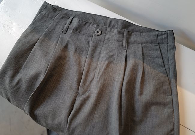 腰回りは2タック仕様。タックによる分量感がヒップからワタリにかけて自然な立体感を生み、動きやすさと同時に品のある佇まいを演出します。深めに設定された股上と相まって、ルーズでありながらだらしなく見えない、計算されたバランスが魅力です。