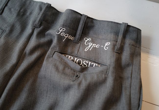 素材にはWOOLファブリックを採用。SEQUELでは比較的珍しい素材使いで、ワークパンツでありながら表情は非常にクラシカル。ウール特有のしなやかさと上品なドレープが、カジュアルなスタイリングでも大人びた印象を与えてくれます。バックポケットに配されたプリントデザインが、さりげないアクセントとしてブランドらしさを主張します。