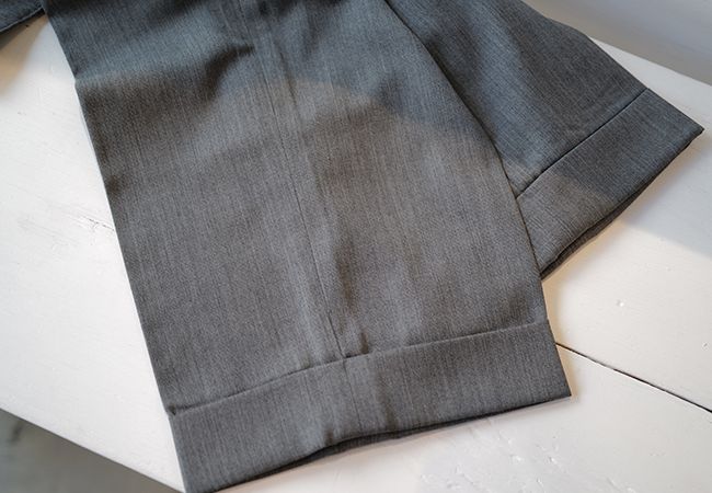 裾はダブル仕上げ。生地の落ち感を活かし、ボリュームのあるシルエットを足元でしっかりと受け止めることで、全体を引き締めています。革靴からスニーカーまで、合わせるシューズを選ばない汎用性の高さもポイントです。