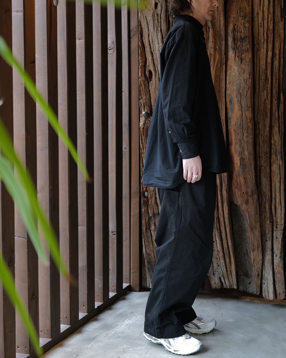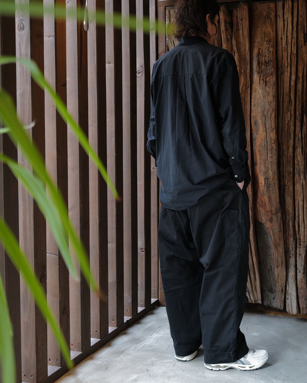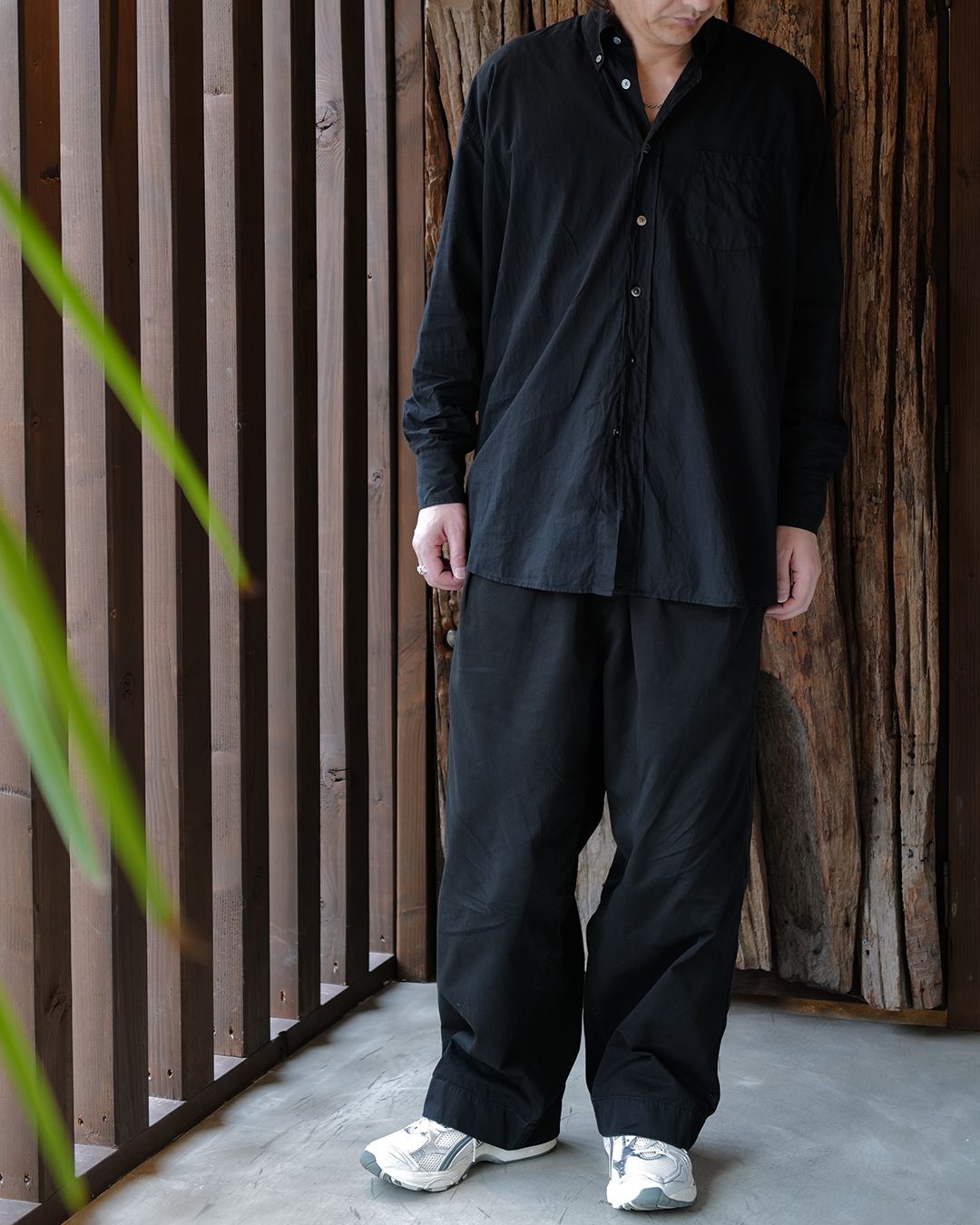 “BORROWED”の名の通り、あえて大きく設計されたパターンで、肩の落ち方や袖の分量感がスタイルに動きを出してくれる一着。