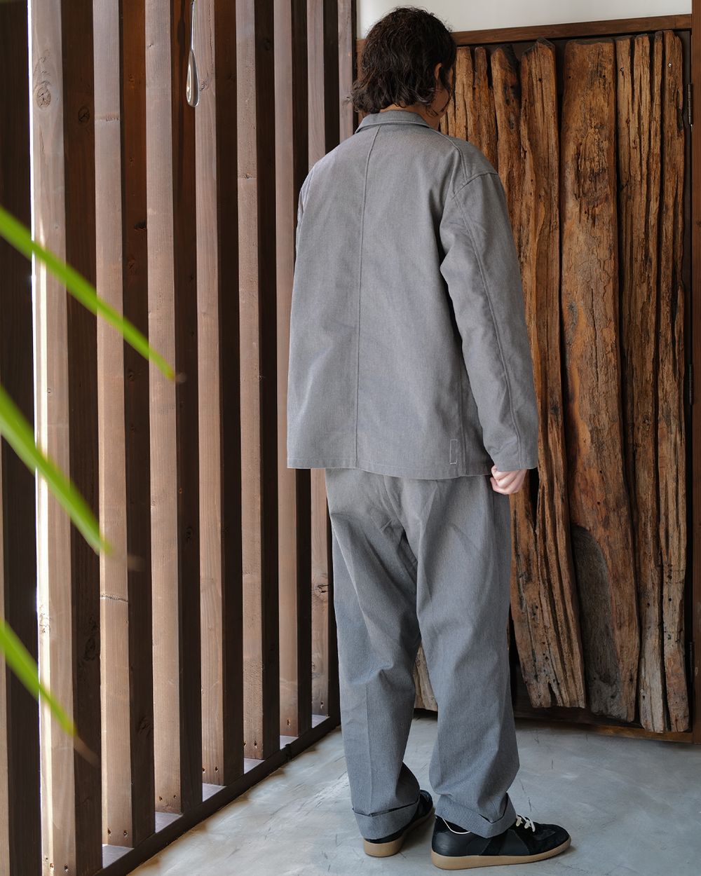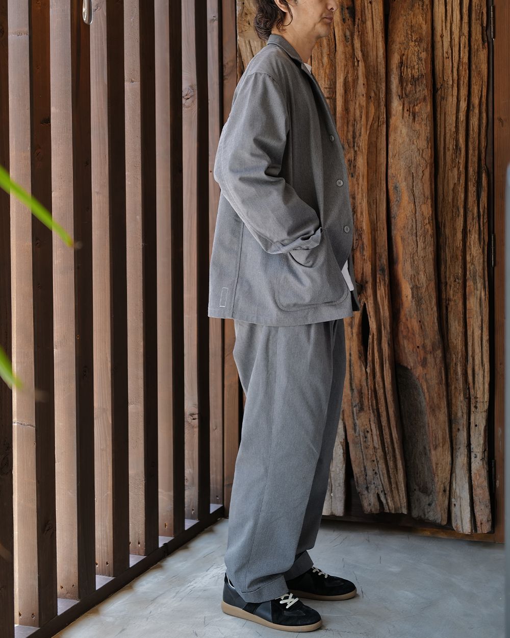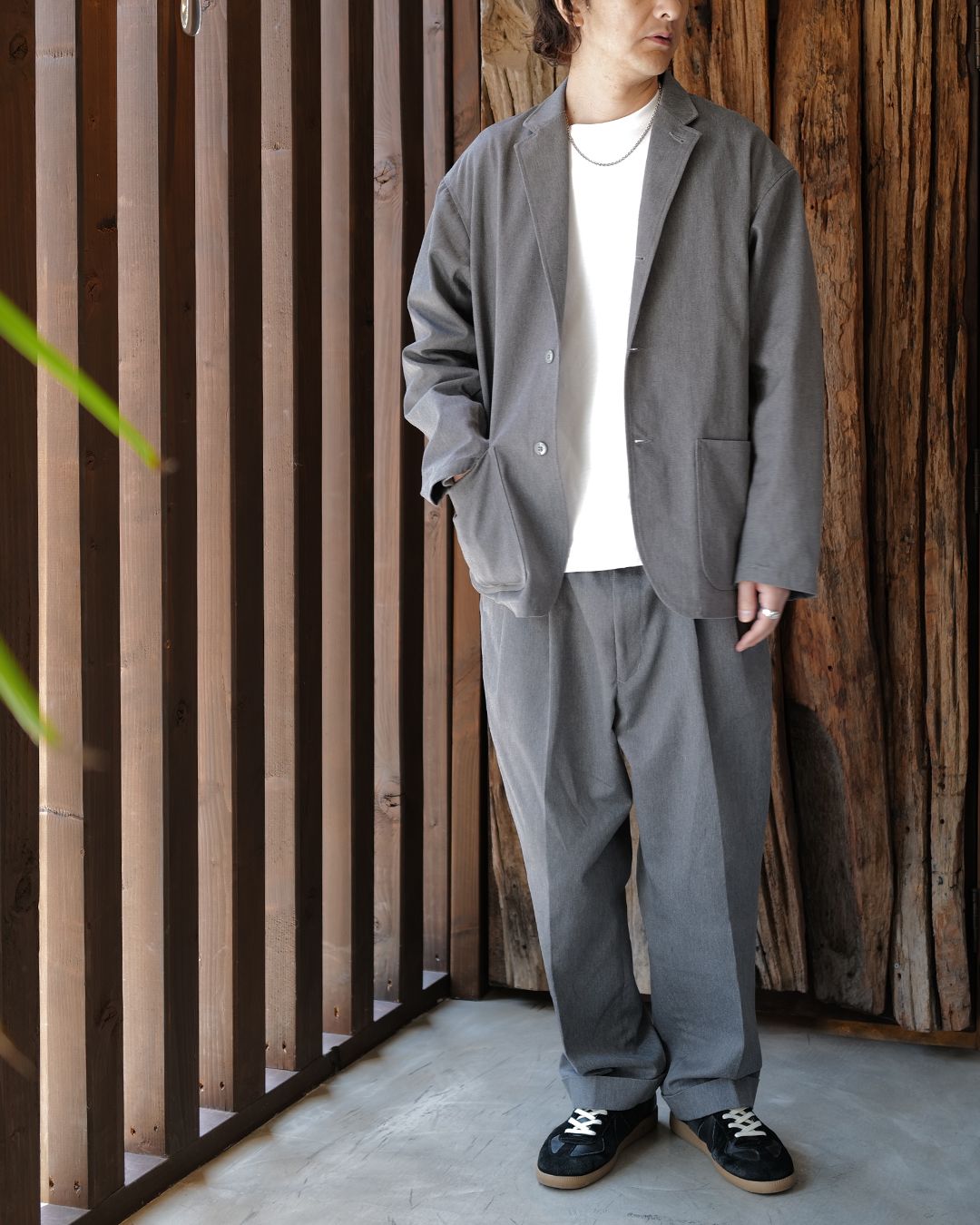 ジャケットはややルーズな作りで肩も少し落ちるので、カチッとしすぎずリラックスしたバランス。パンツもタック入りで腰回りにゆとりがあり、全体的に空気を含むようなシルエットが気に入っています。