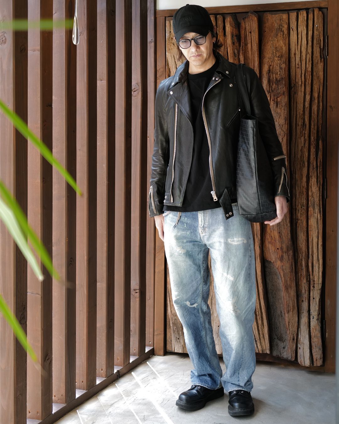 ブラックベースにネイビーのレザーが切り替えで入っているのがアクセントで、シンプルだけどしっかり個性が出る1着です。