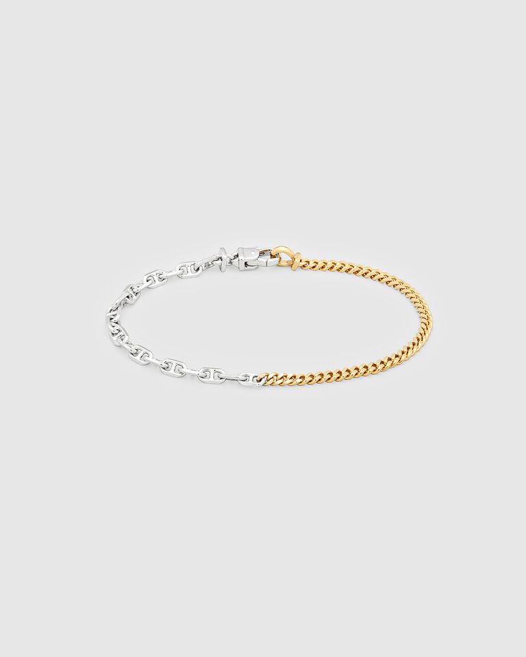 このブレスレットはリサイクル・スターリングシルバー925製で、リサイクル・ホワイトロジウムと18Kゴールドのプレーティングが施されています。