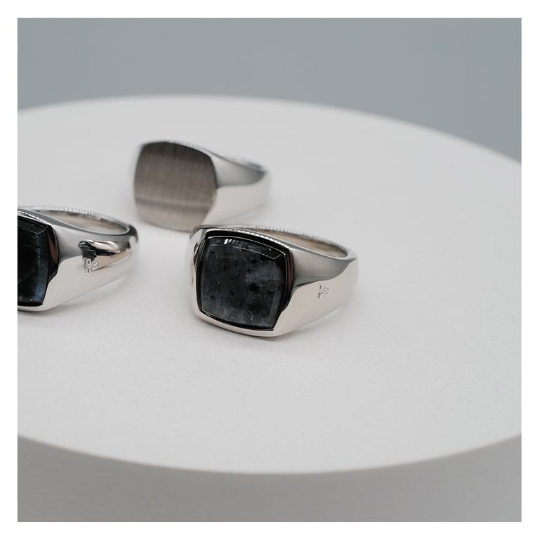 ケイ・リング・ラルビカイトは、ミディアムサイズのトムウッドの定番シグネットリングです。明るいポリッシュ仕上げのシルバーの表面に、カスタムカットのラルビカイトをベゼルセッティングしています。