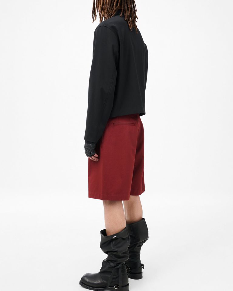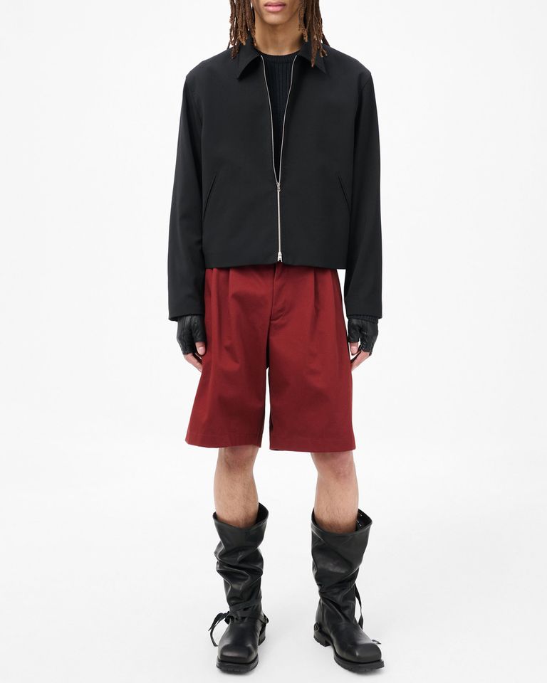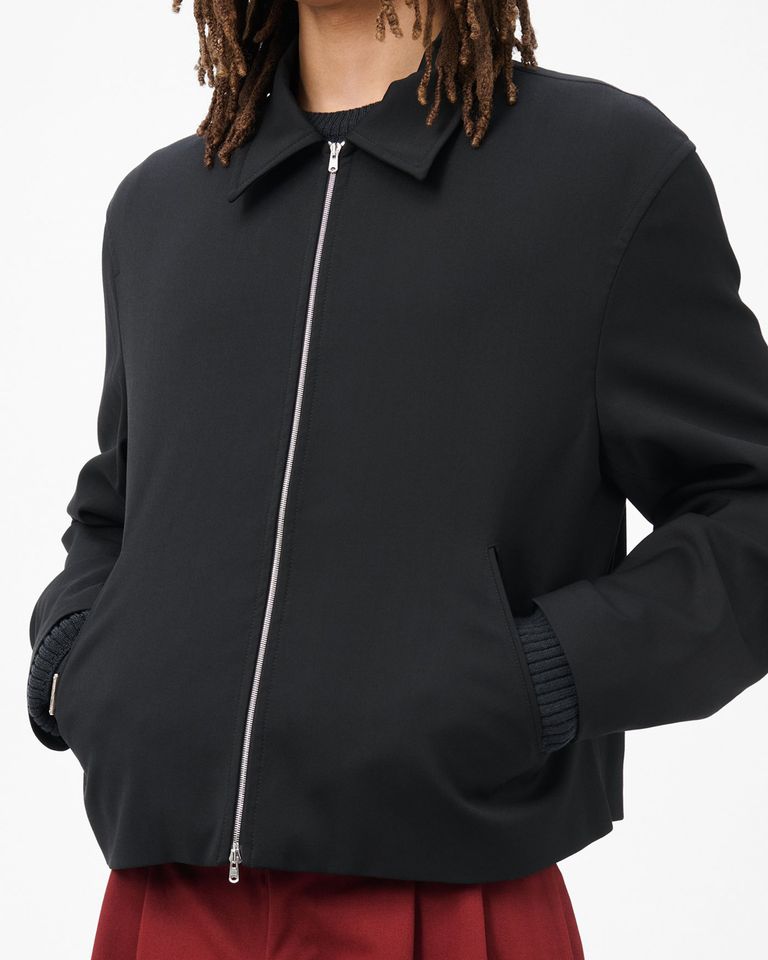イタリア産のバージンウールスーツ地を使用したミニマルなミニジャケットは、ボックスフィットで、RiRiのツーウェイジップ、キュプラの裏地、ジェットフロントポケットが特徴です。
