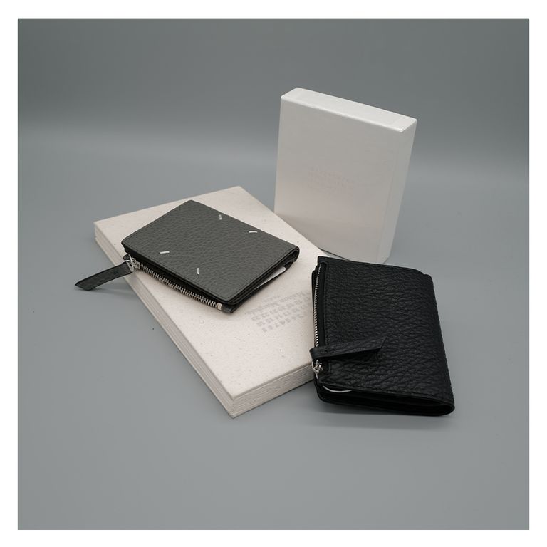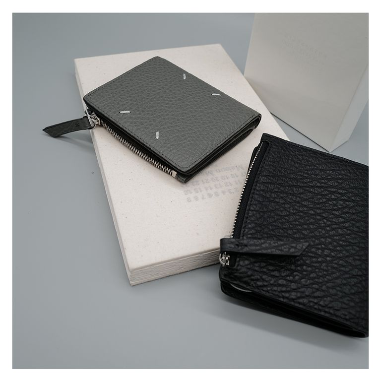 ファスナー付きのセクションとカードホルダーを備えたグレイニーレザー製のレザーフリップフラップウォレットです。