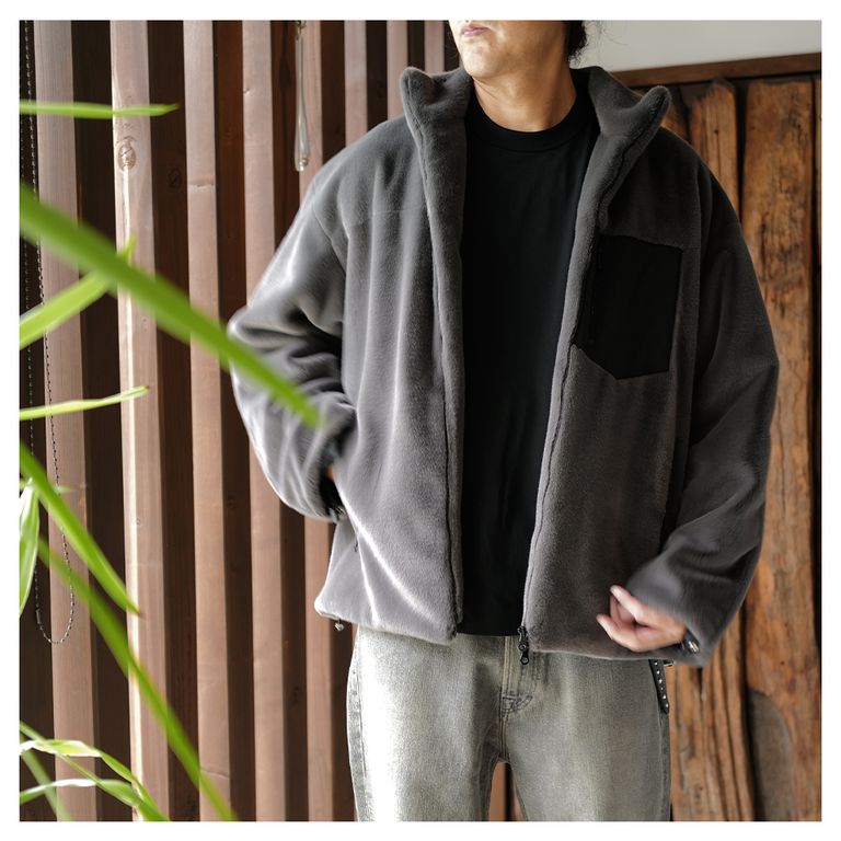 ・胸元に配置した異素材のポケットがアクセントに。ジップ付きで実用性も兼備
