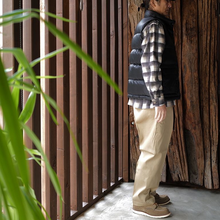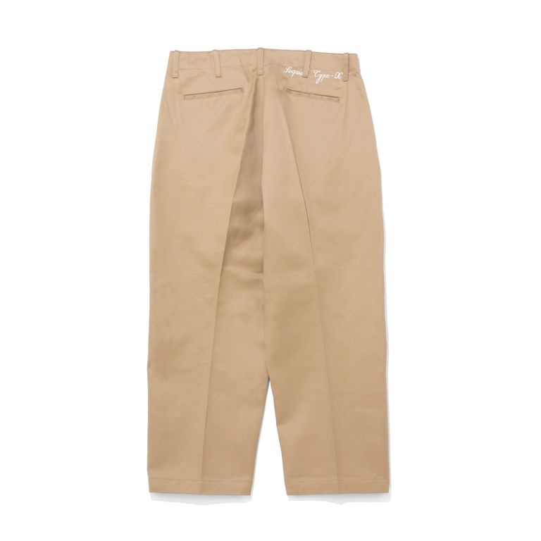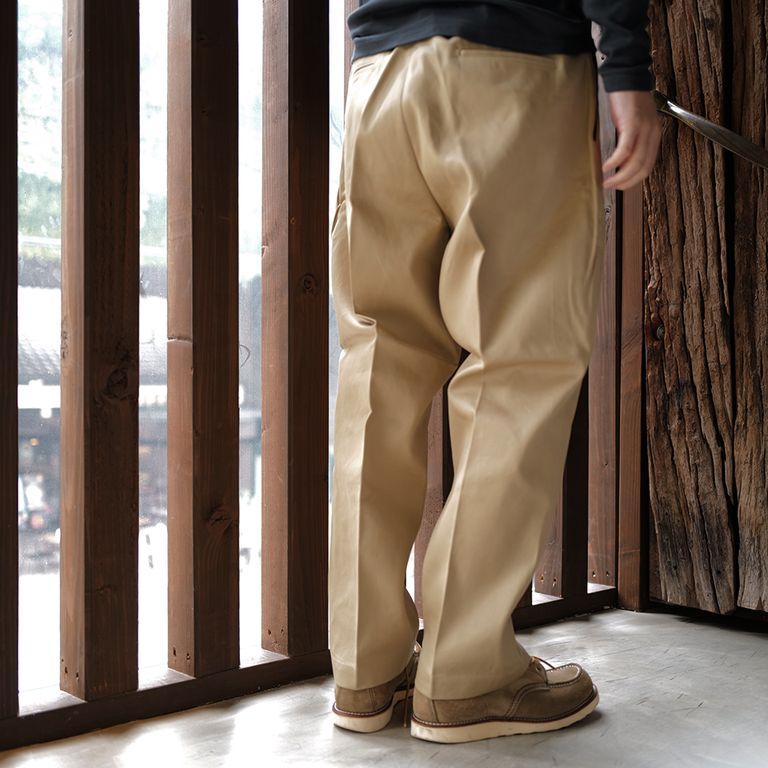 ワイドシルエットのワークパンツ、コットン素材で、バックポケットとベルトループ下にプリントデザインが入ります。
