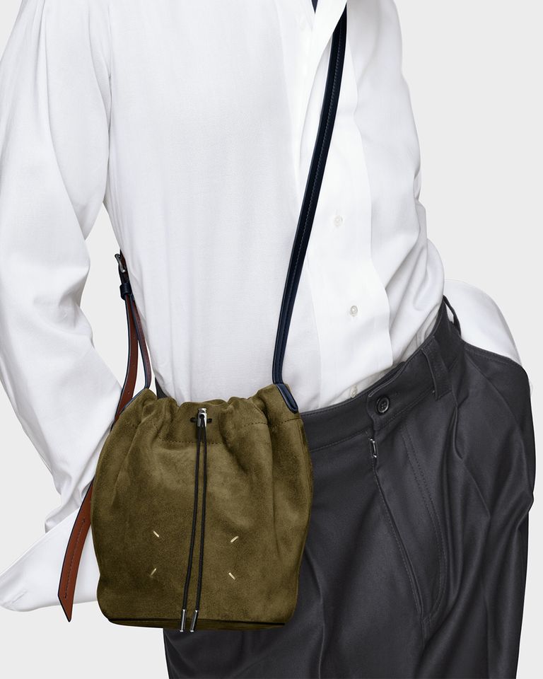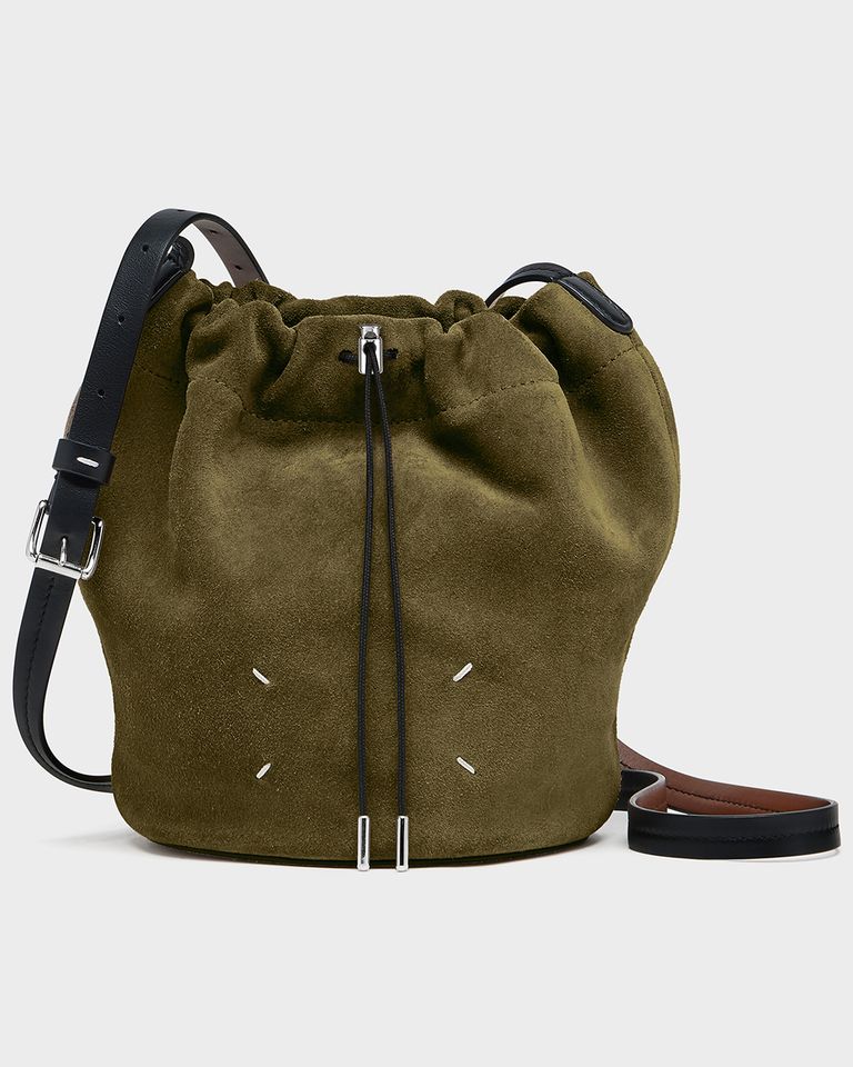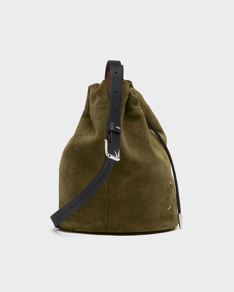 スエードで構築された彫刻的なシルエットが特徴で、ドローストリングクロージャーで開閉し、コントラストの効いたベルト風ショルダーストラップは調整可能。