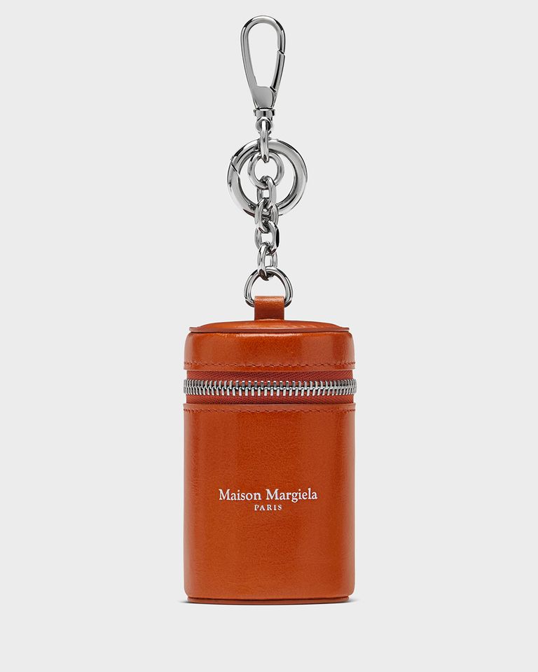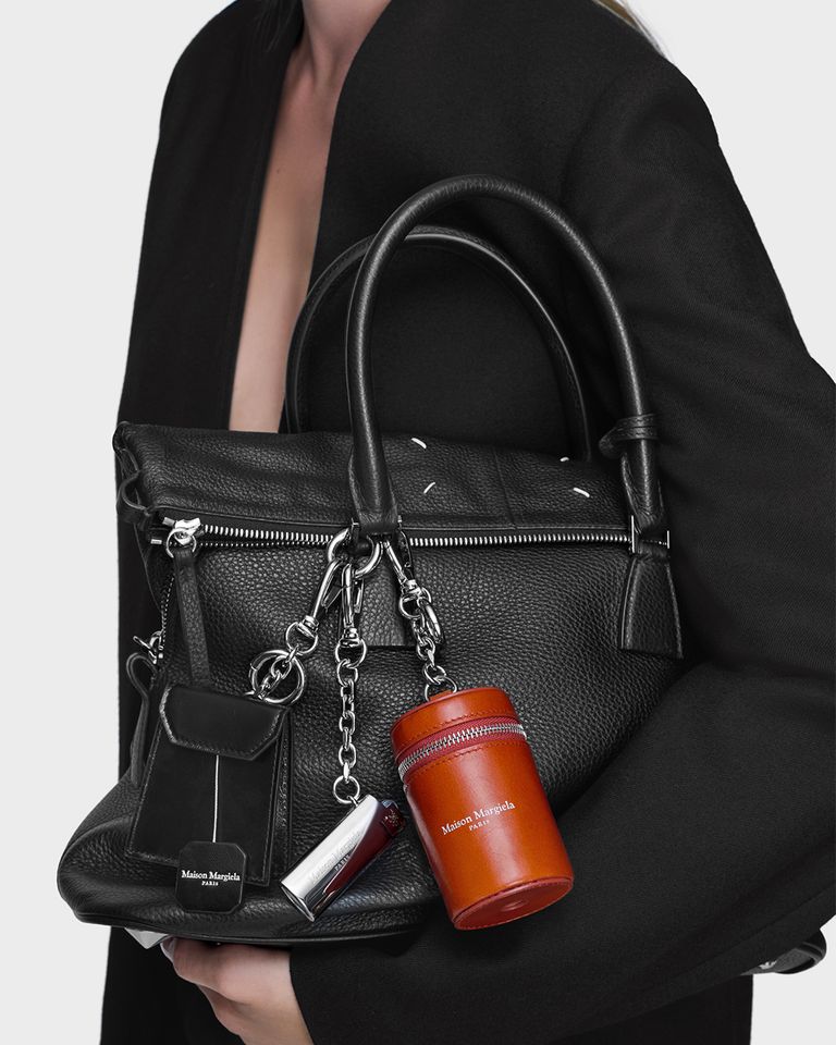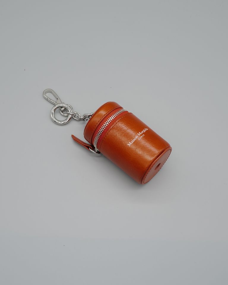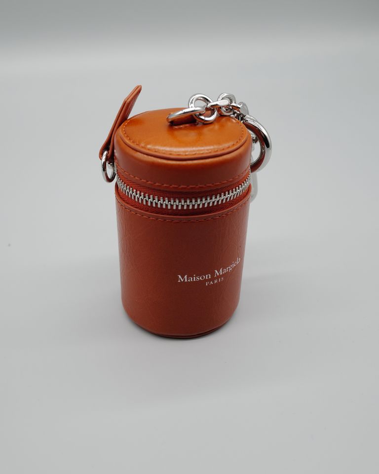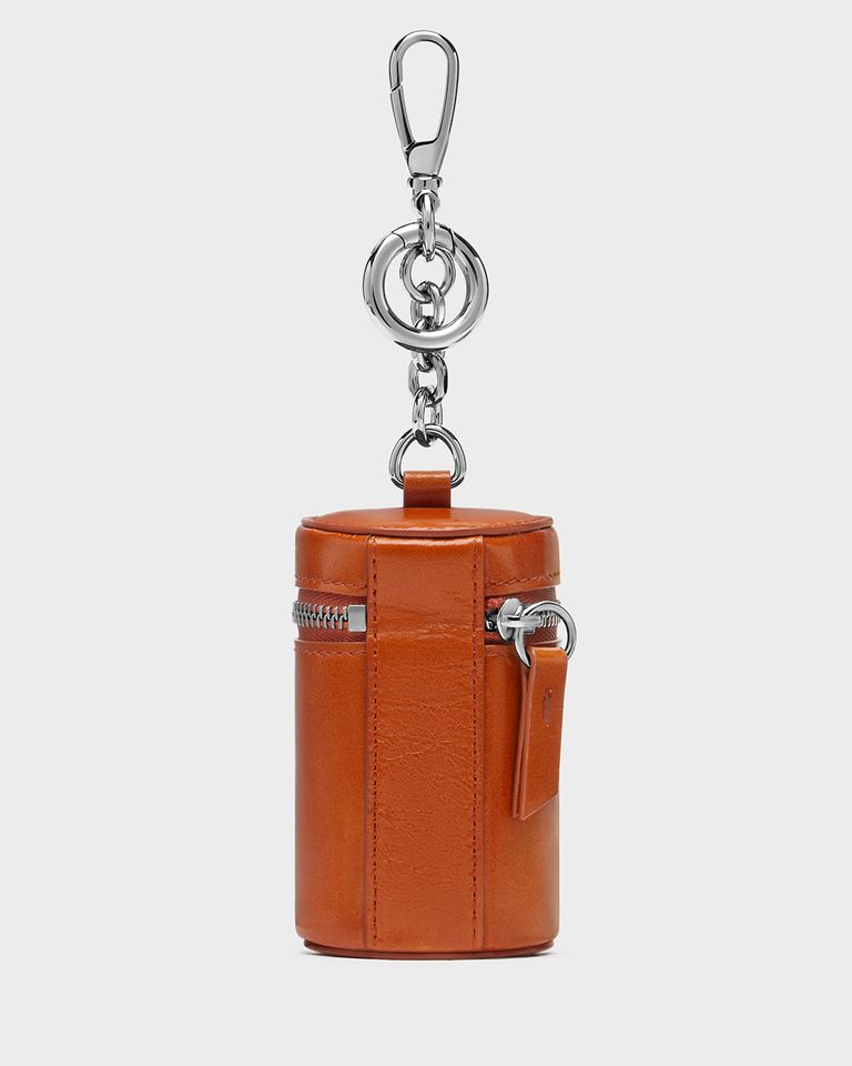 シワ加工を施した光沢のあるレザーを使用した、円筒形のポーチチャーム。
