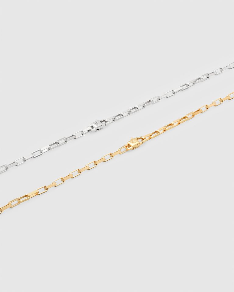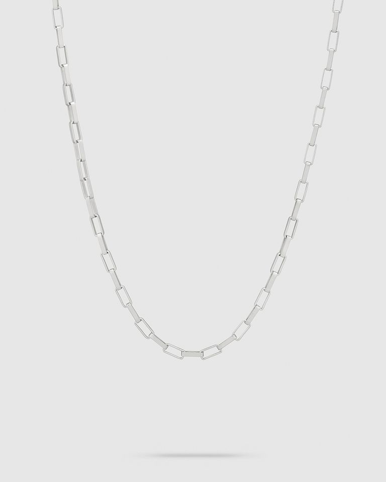 このチェーンはポリッシュ仕上げのスターリングシルバー925製で、表面を強化し変色を防ぐためにホワイトロジウムプレーティングが施されています。