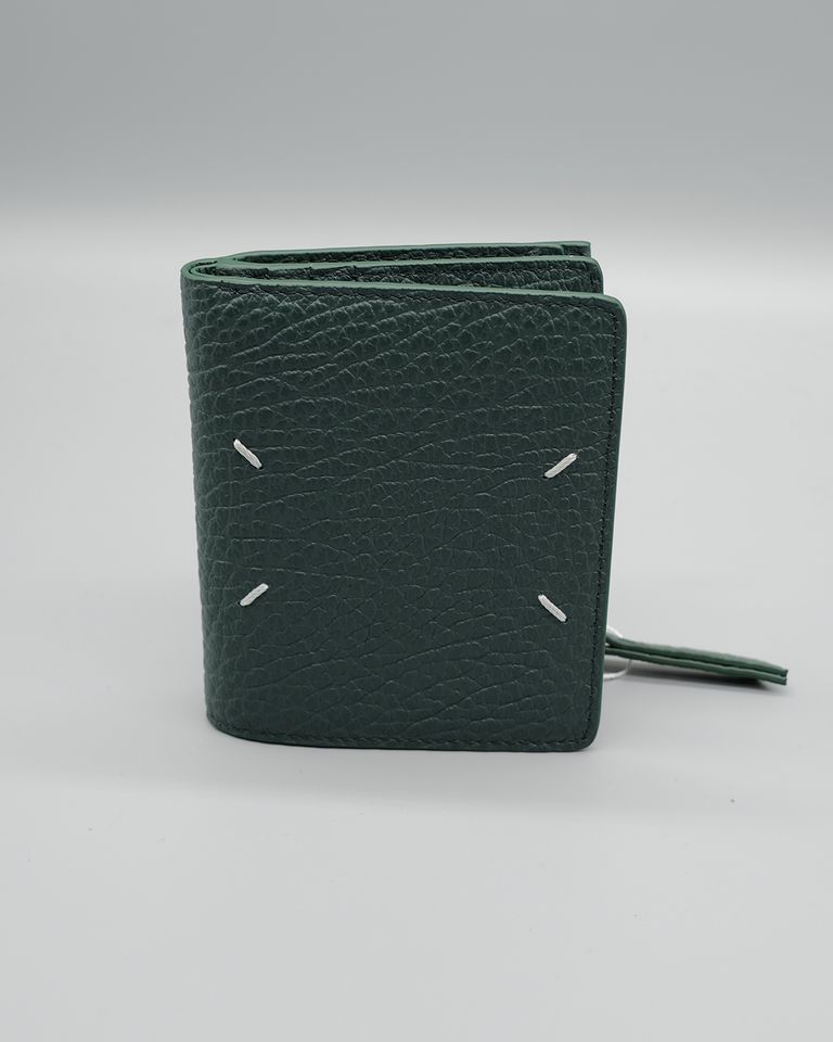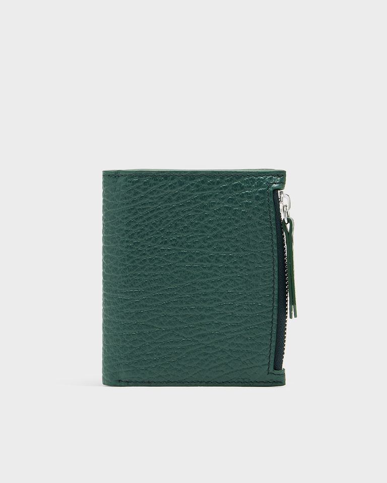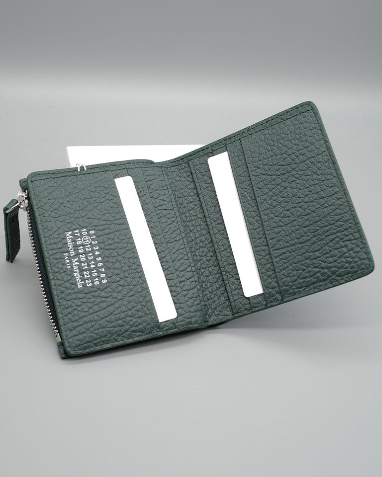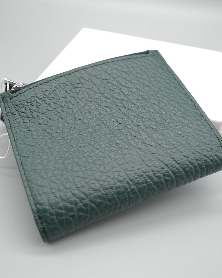 ファスナー付きのセクションとカードホルダーを備えたグレイニーレザー製のレザーフリップフラップ ウォレットです。