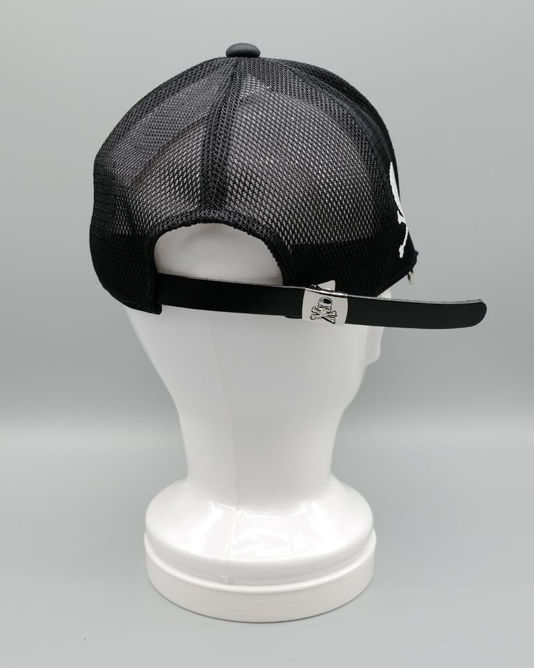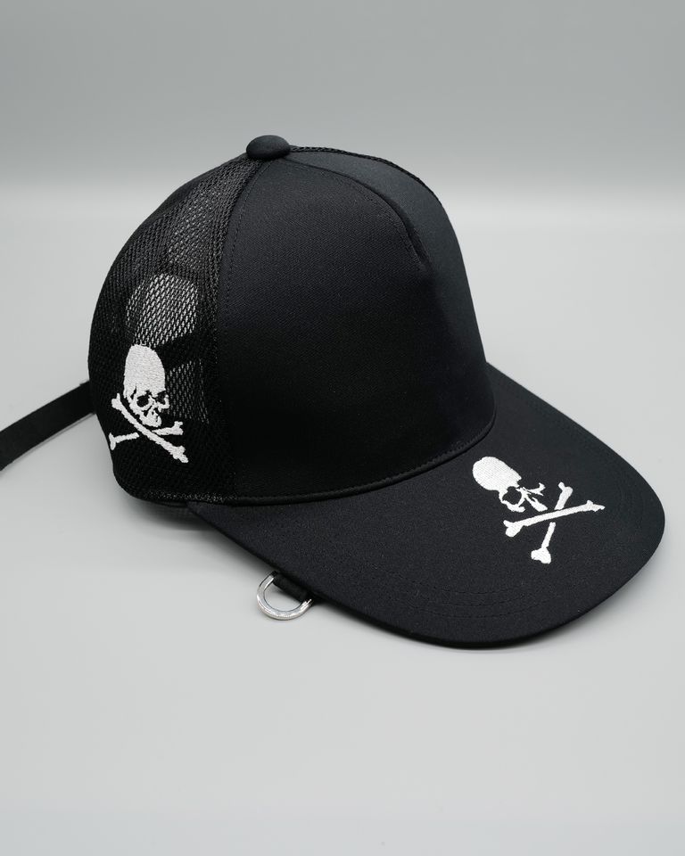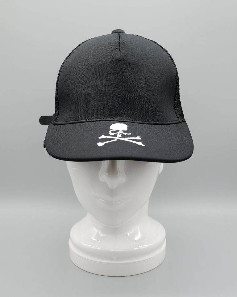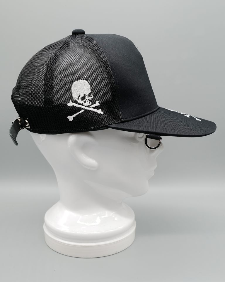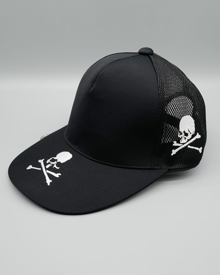 Cap made by polyester hollow fiber, which is using a special method to put air in the yarn to make lighter and softer texture. Embroidery SKULLS on the brim, and sides.