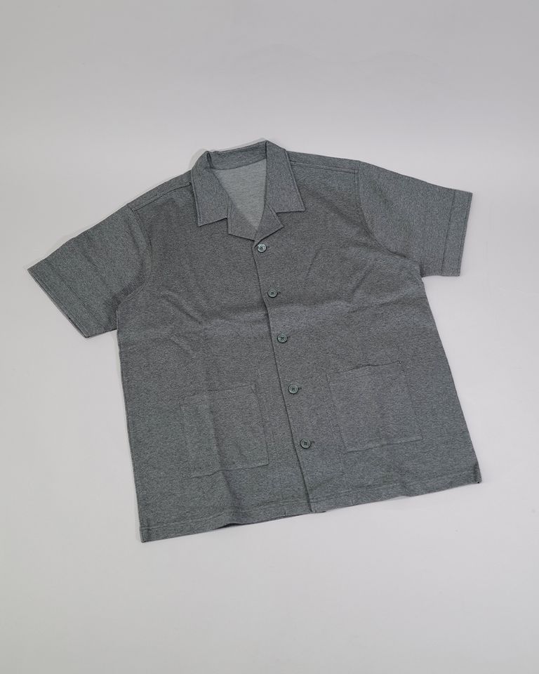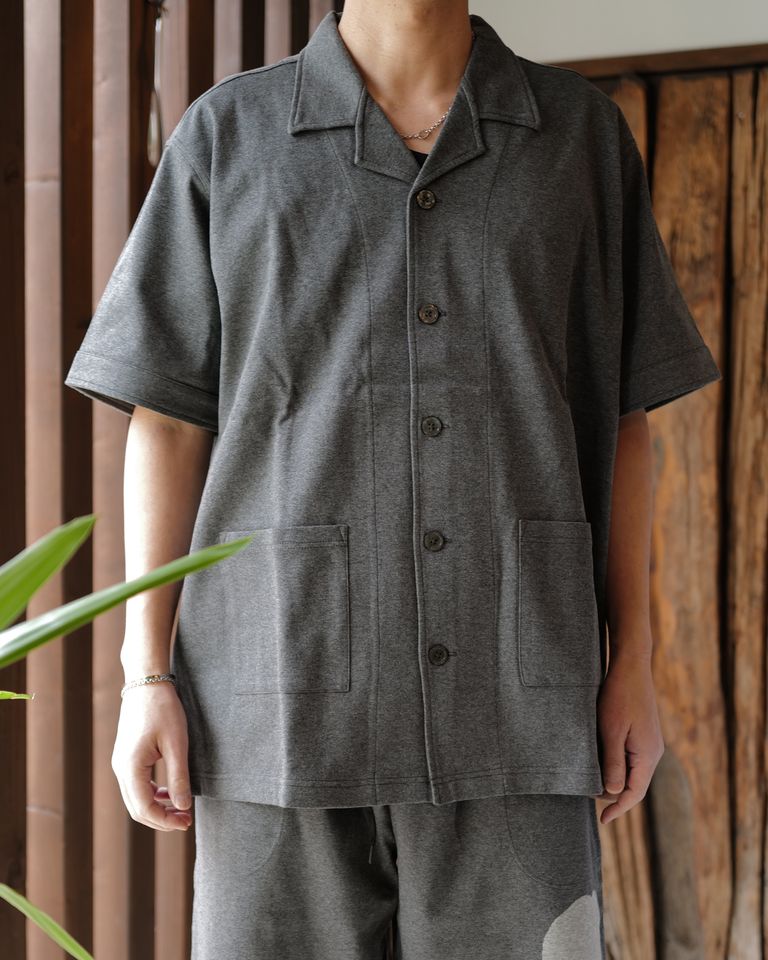 トップスは半袖シャツ型のデザイン。Tシャツとは異なり、前立てや襟の存在が程よく“きちんと感”を演出し、部屋着特有のラフさを抑えています。リラックスしたシルエットながらも、肩線や身幅のバランスが良く、着用時にだらしなく見えない設計です。