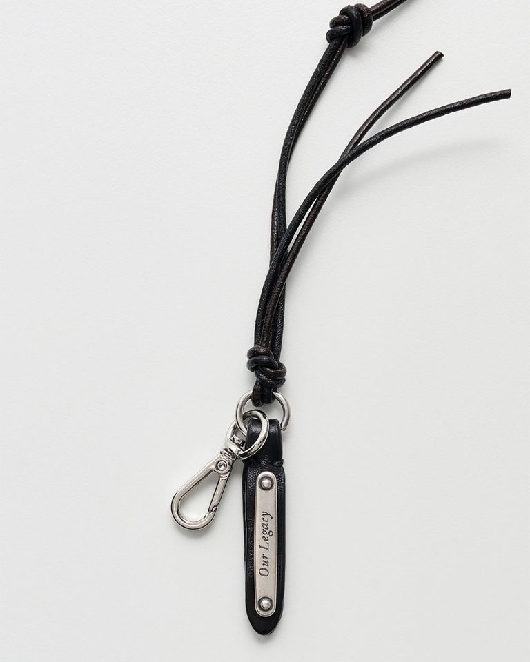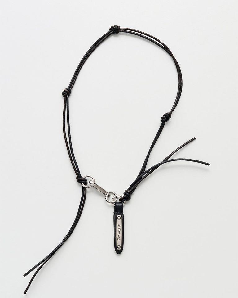 留め具とリングで留める、結び目のついた上質なレザーコードで作られたスーパースリムラドンは、長さ約40cmで、Our Legacyの刻印入りメタルプレートが付いたレザータブが特徴です。
