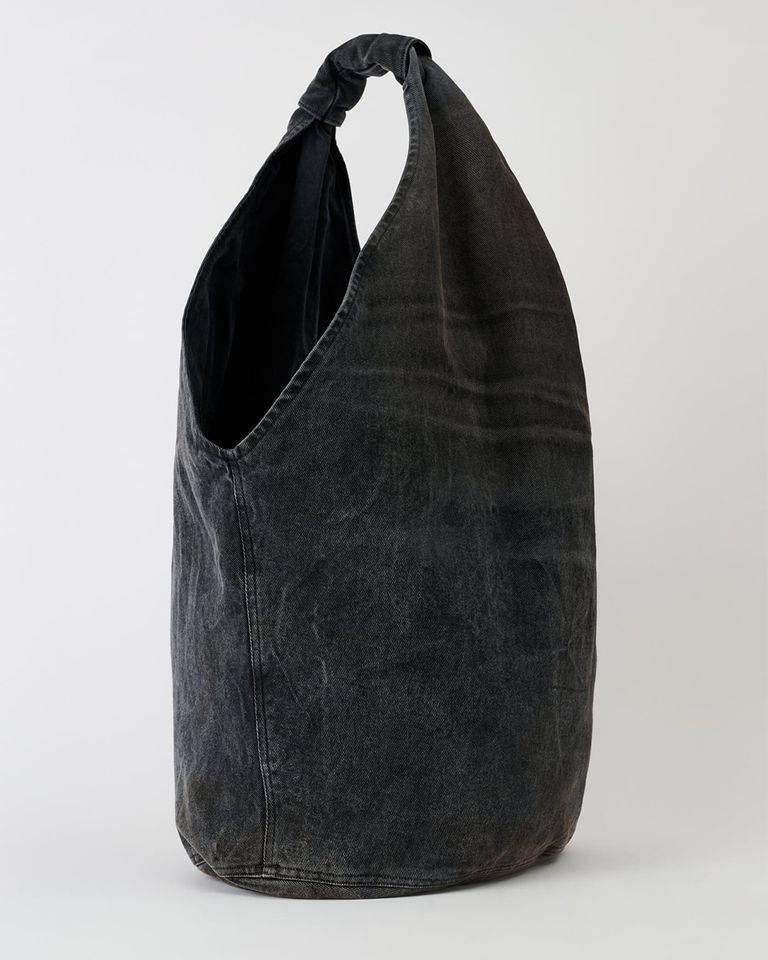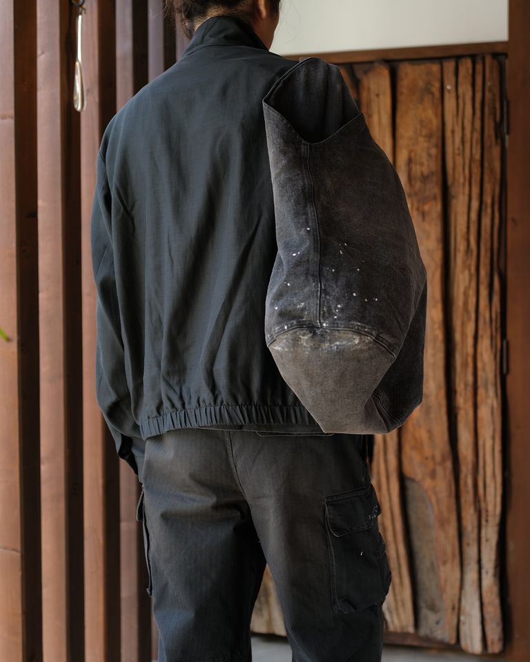 エクリュに顔料オーバーダイを施し、手作業でヴィンテージ感と風合いを出したイタリア製デニムを使用。中央に大きなポケット、ショルダーストラップ、補強されたキャリーハンドルを備えています。