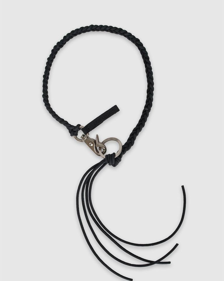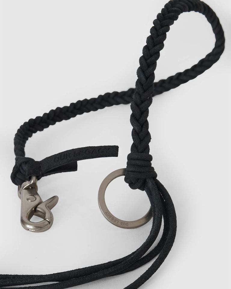 イタリアンレザーを使用したこのキーホルダーは、編み込みレザーコード、「OUR LEGACY」の刻印が入ったWリング付きの日本製金具、そして手縫いのレザータブが特徴です。