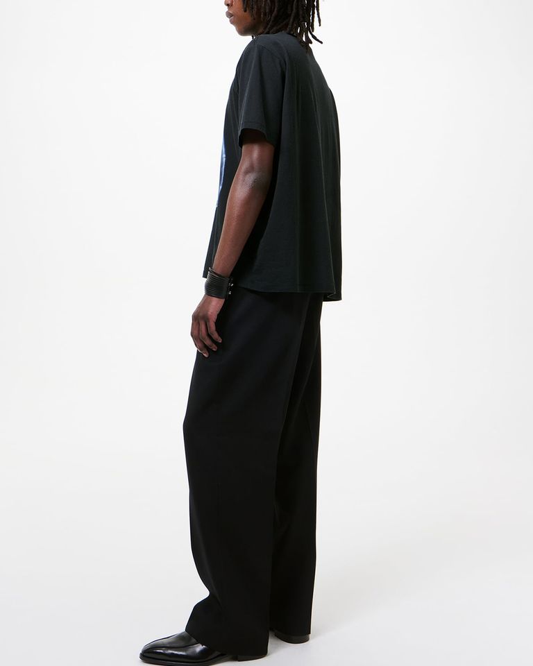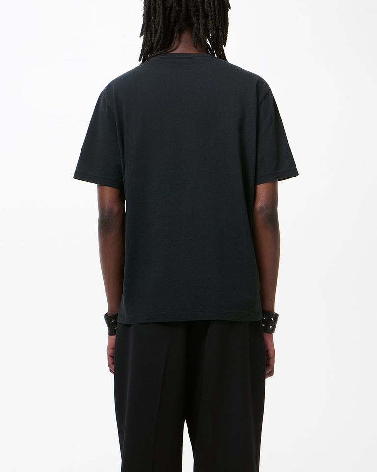 ポルトガル産コットンジャージーに堕天使プリントを全面にプリントしたニューボックスTシャツは、ワイドなボックスフィットで、細リブカラー、オーバーロック加工の肩の縫い目、そしてストレートな裾が特徴です。