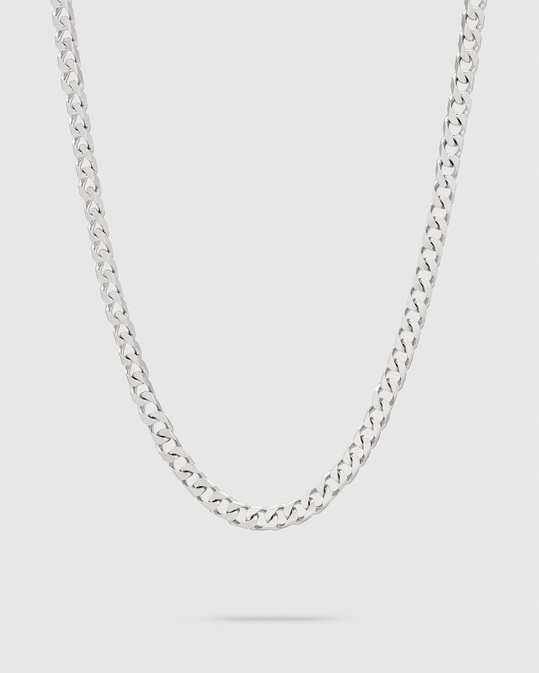 このチェーンはサテン仕上げのスターリングシルバー925製で、表面を強化し変色を防ぐためにホワイトロジウムプレーティングが施されています。