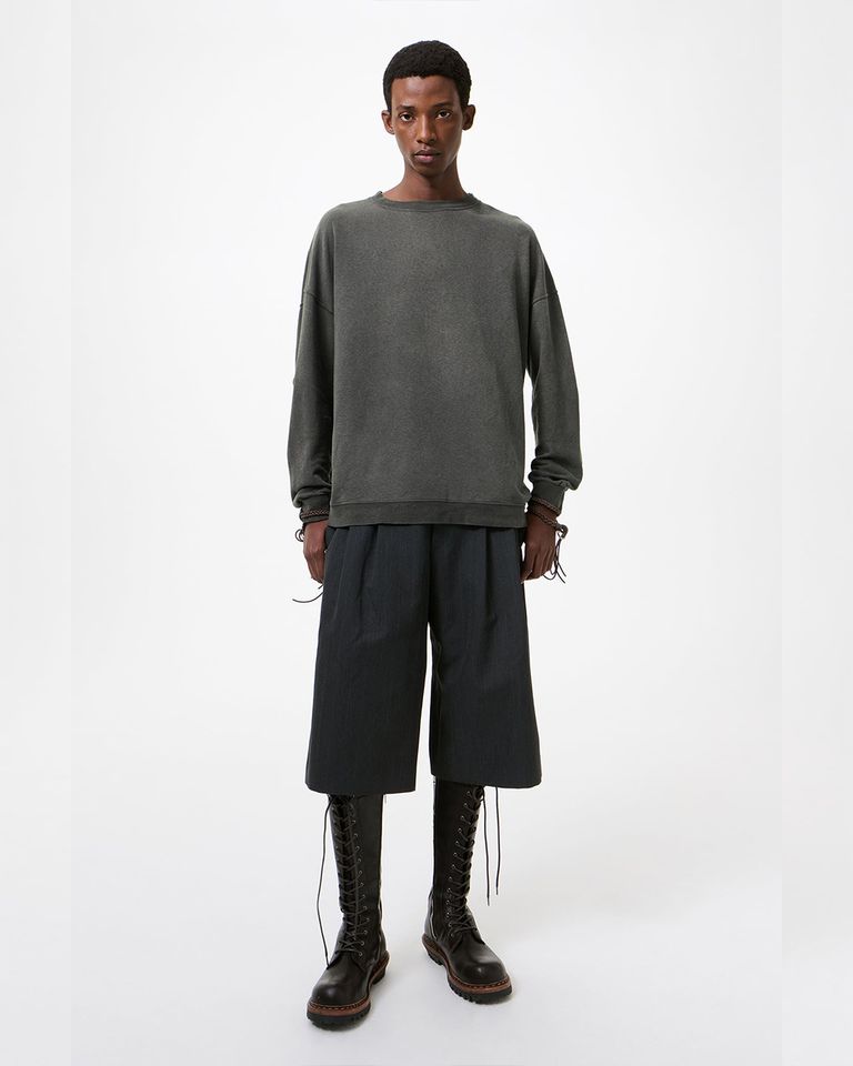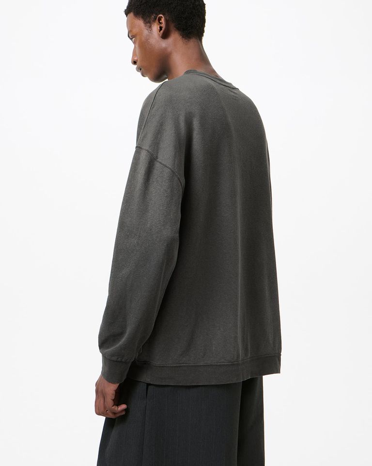 ウォッシュドブラックのローグループバックを使用したスラックスウェットシャツ。コットン、リネン、エラスタンをブレンドしたイタリア製のループバック生地を使用し、ゆったりとしたロング丈のオーバーサイズフィットを実現。ネックラインはゆったりとしたシルエットで、リブ編みの袖口と裾、肩の縫い目はオーバーロック仕上げとなっています。
